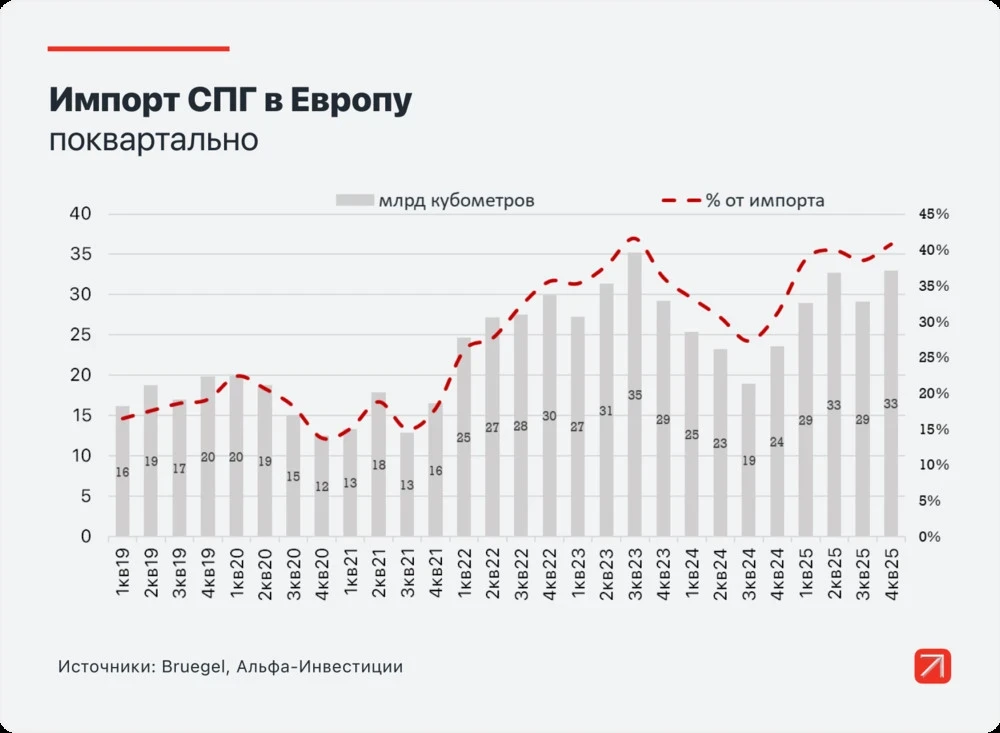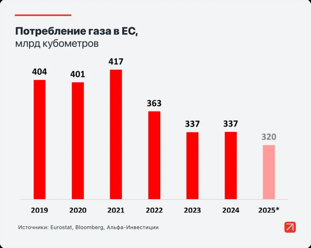 С Ближнего Востока ЕС получает всего 11,4 миллиарда кубометров газа. Однако рынок СПГ взаимосвязан, и потеря крупного поставщика затрагивает всех потребителей. Кроме того, ЕС планирует отказаться от российского СПГ, поставки которого в 2025 году составили 20 миллиардов кубометров. Этот газ не исчезнет с мирового рынка, но его покупатели найдутся в Азии, а для ЕС он станет недоступным.