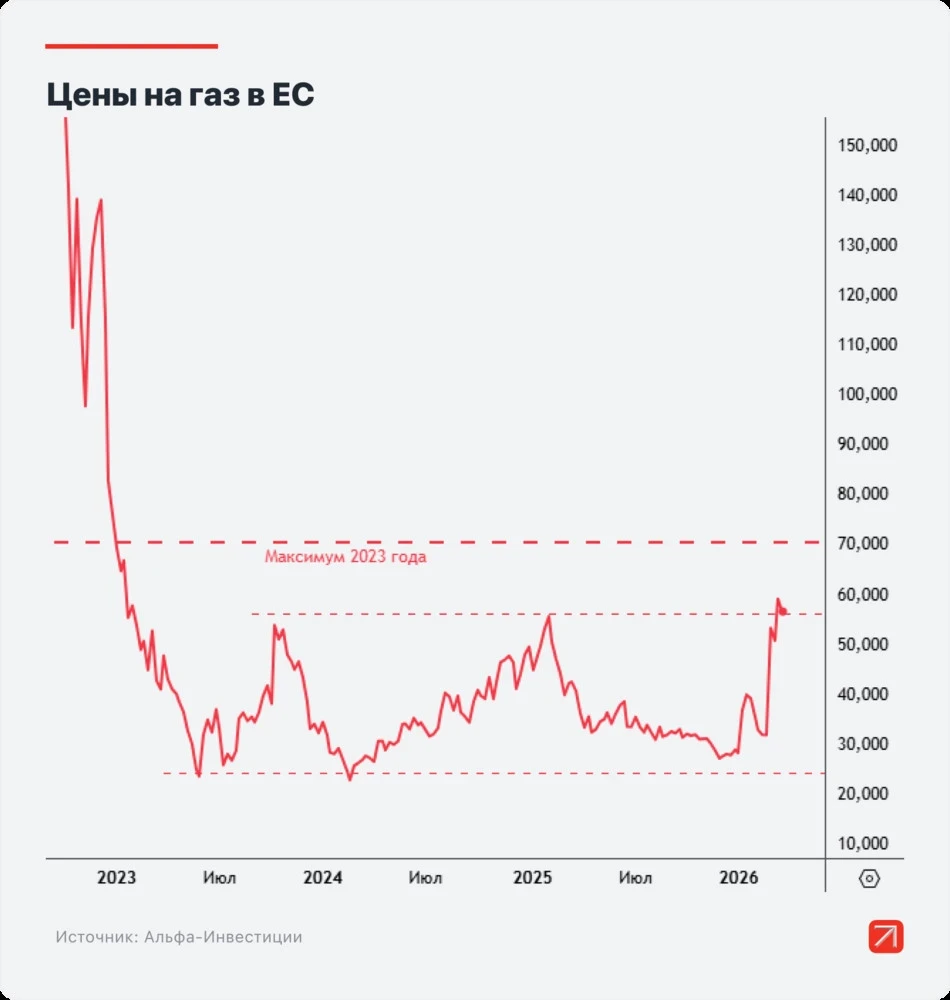 • Предложение более высокой премии за СПГ — что, в свою очередь, приведет к дальнейшему росту цен. С начала марта цены на газ TTF, основной индекс в регионе, увеличились более чем вдвое. Однако это может быть не предел. Текущие котировки не учитывают риски длительного закрытия Ормузского пролива и повышенного спроса в Азии из-за летней жары. Если эти риски реализуются, котировки TTF могут обновить рекорды 2023 года.