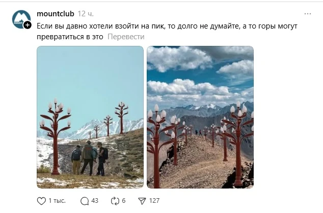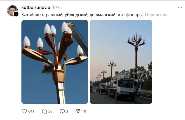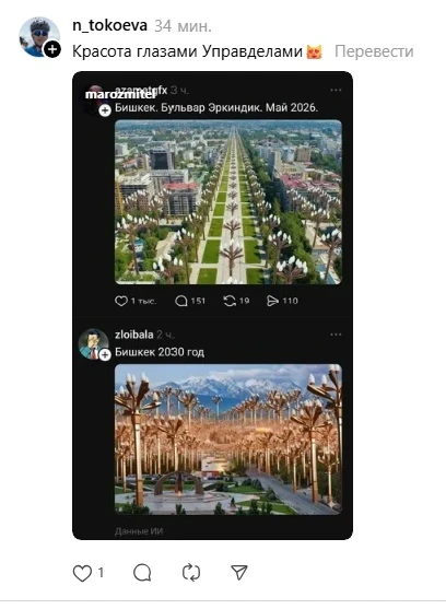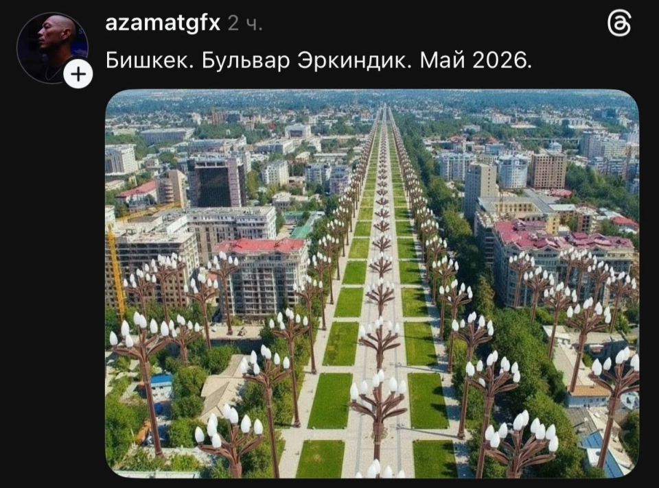 Посты с подписями вроде «Бишкек 2030» и «Бульвар Эркиндик. Май 2026» стремительно набирали популярность, получая сотни лайков. На изображениях можно увидеть бесконечные ряды огромных фонарей в форме тюльпанов, которые пользователи иронично называют «символом урбанистического апокалипсиса».