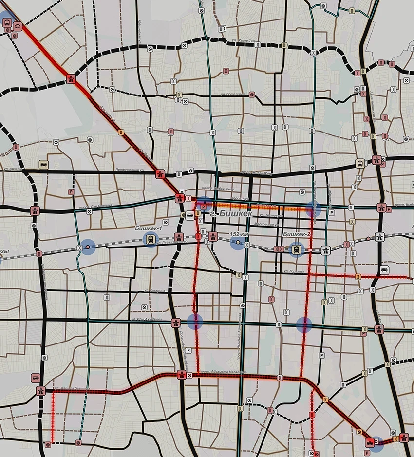 Кроме того, рельсовый общественный транспорт будет курсировать по улицам Абдрахманова, Горького, Киевской, Масалиева, Асаналиева, а также по другим участкам городских улиц.