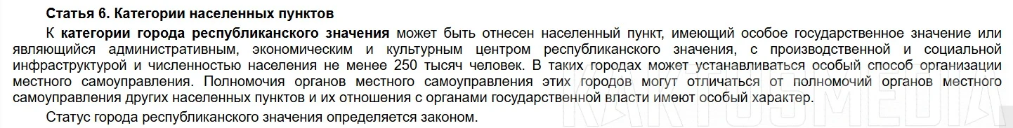В соответствии с статьей 6 Закона "Об административно-территориальном устройстве Кыргызской Республики", к категории города республиканского значения может быть отнесен населенный пункт, имеющий особое государственное значение или являющийся административным, экономическим и культурным центром, с необходимой производственной и социальной инфраструктурой и численностью населения не менее 250 тыс. человек. В таких городах могут быть установлены особые способы организации местного самоуправления, и их полномочия могут отличаться от полномочий других населенных пунктов.Статус города республиканского значения определяется законом.