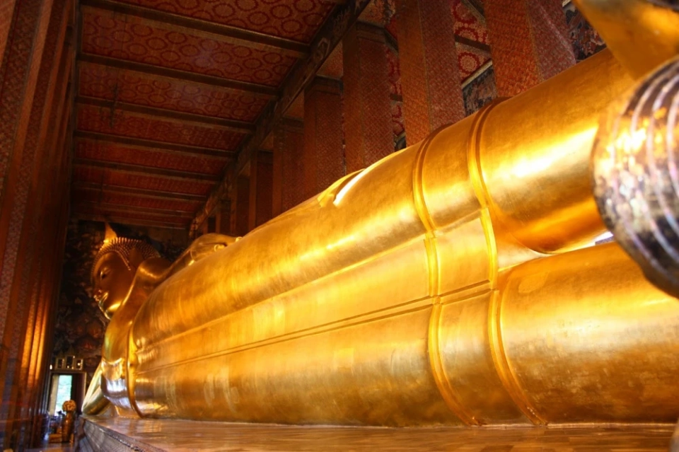 Рядом расположен Храм Лежащего Будды (Ват Пхо), где находится гигантская 46-метровая позолоченная статуя.