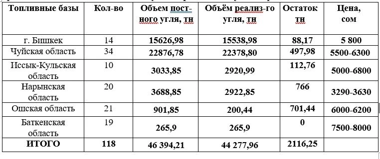 В Ошской области уголь продается по цене 6000 сомов за тонну в следующих местах: