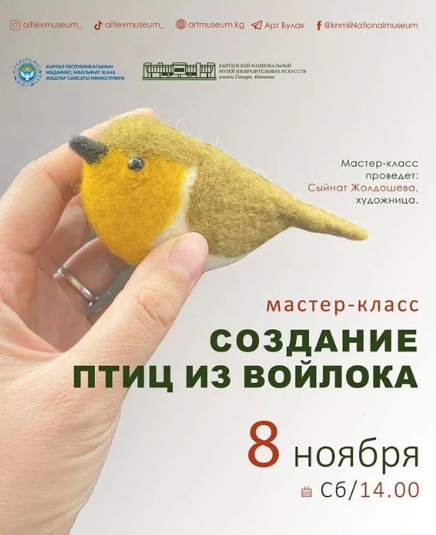 На мастер-классе участники освоят технику сухого валяния и научатся создавать фигурки птиц под руководством художницы Сыйнат Жолдошевой.