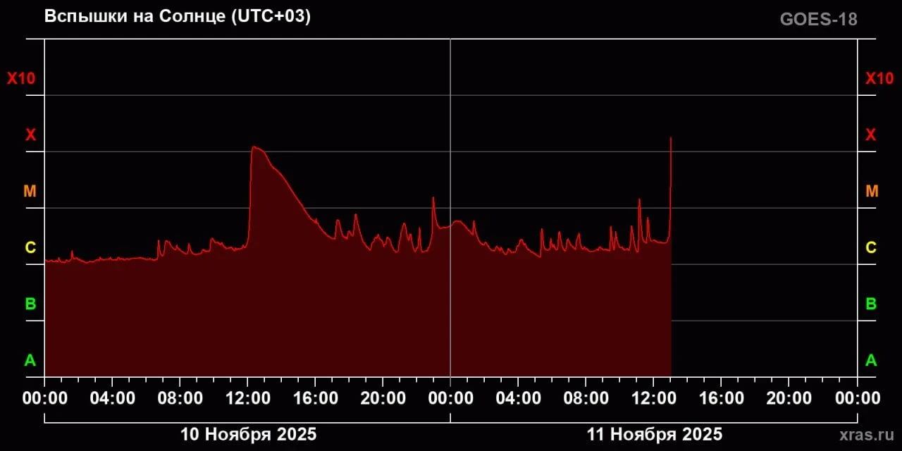 10 ноября на Солнце было зафиксировано 15 вспышек, включая одну из них класса Х1.2, как сообщает...