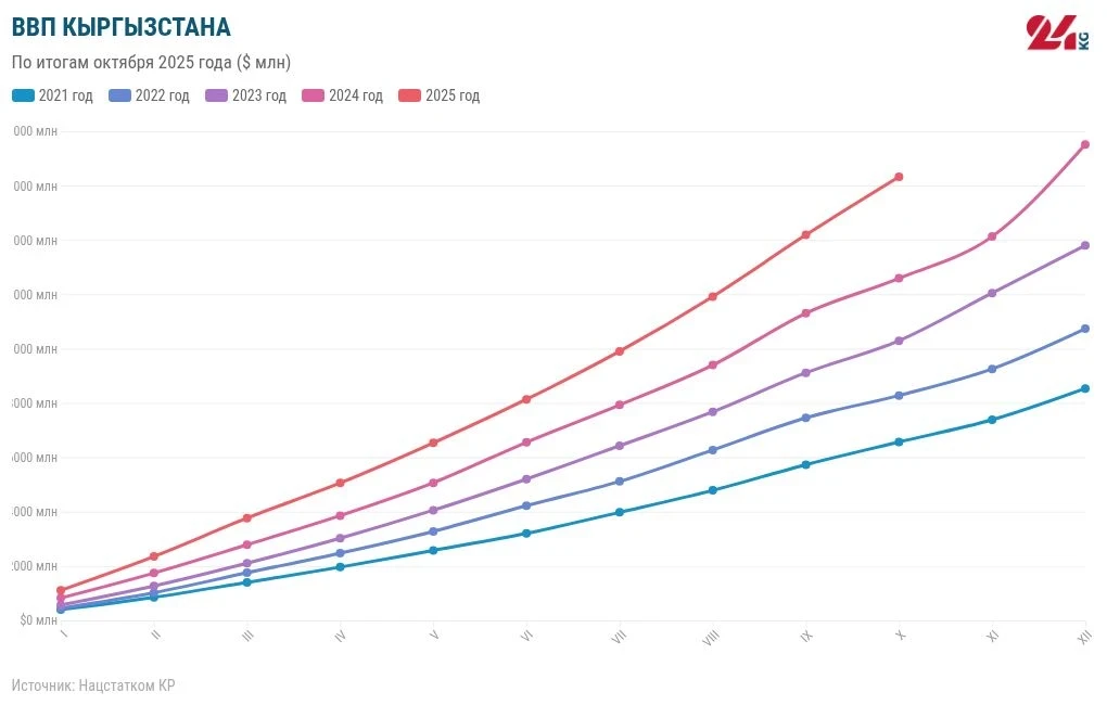 Рост инвестиций в основной капитал по сравнению с январем — октябрем 2024 года составил 21,8 процента благодаря увеличению внутренних источников финансирования. Объем внешних инвестиций увеличился на 5,2 процента, достигнув 246 миллиардов 702 миллионов сомов за 10 месяцев.
