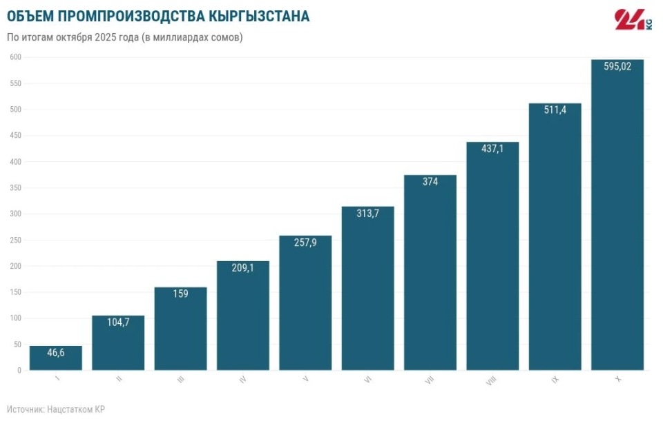 За девять месяцев 2025 года объем промышленного производства составил 595 миллиардов 17 миллионов сомов, что на 9,8 процента больше по сравнению с аналогичным периодом 2024 года. Этот рост обусловлен увеличением производства в ряде секторов: