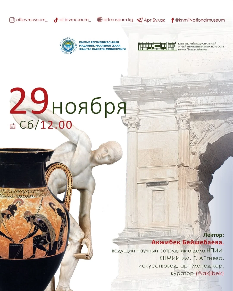 В этот день мы погрузимся в мир искусства Древней Греции и Рима. Лектор — искусствовед Акжибек Бейшебаева.