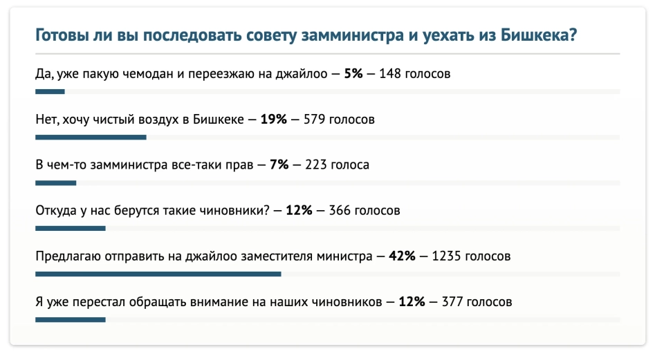 — 42 процента (1 232 голоса) предложили отправить заместителя министра на джайлоо;