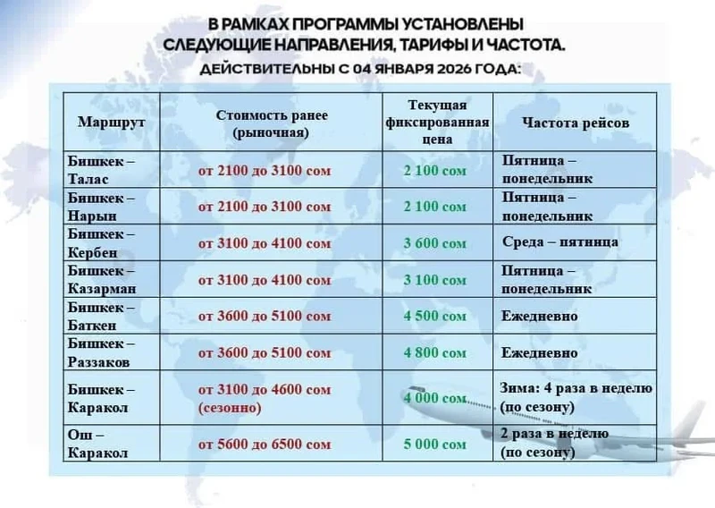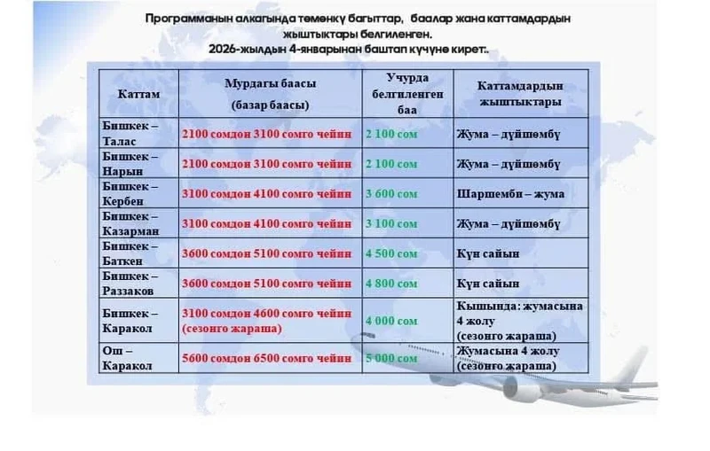 Согласно указанию президента Садыра Жапарова, в 2026 году установлены фиксированные цены на внутренние авиаперевозки, которые будут ниже рыночных. Разница в стоимости авиабилетов будет покрыта средствами из Стабилизационного фонда.