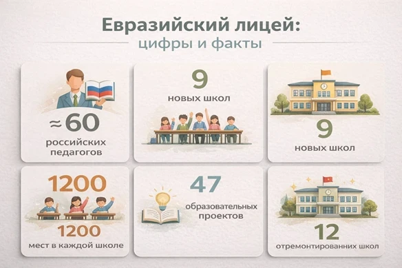 Проект «Евразийского лицея» включает в себя массовые образовательные инициативы. В Кыргызстане АНО «Евразия» реализует проект строительства 9 новых кыргызско-российских школ. Каждая область получит по одной школе, а в крупных регионах — по две. Эти учебные заведения будут рассчитаны на более чем 1200 мест и будут функционировать по стандартам обеих стран, выдавая аттестаты как кыргызского, так и российского образца. Первые объекты уже начали строиться в Бишкеке, Баткене и Караколе, с планами завершить их к концу 2025 года.