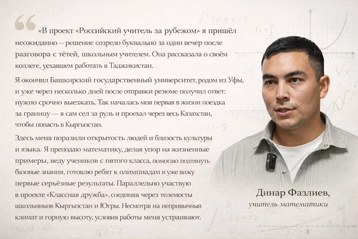 С конца 2024 года в разные уголки страны прибыли около 60 молодых российских учителей, которые обучают математике, физике, литературе, проводят кружки по робототехнике и ораторскому мастерству. В тандеме с кыргызскими коллегами они внедряют новые методики, которые делают обучение более актуальным и интересным.