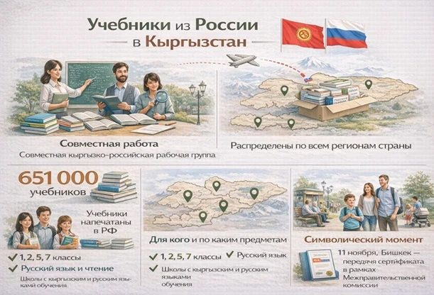 Содержание учебников разрабатывалась совместной кыргызско-российской рабочей группой, включающей педагогов, методистов и экспертов. Результатом стала поставка 651 тысячи экземпляров, которые были напечатаны в России и полностью доставлены в Кыргызстан. Учебники уже распределены по образовательным учреждениям всех регионов и включены в учебный процесс.