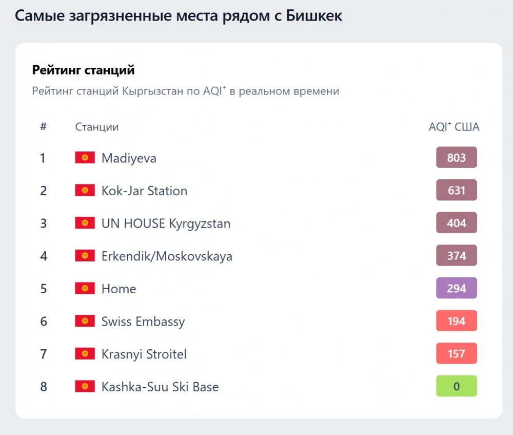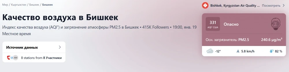 Также сообщается, что уровень мелкодисперсных частиц PM2.5 в Бишкеке превышает среднегодовую норму ВОЗ в 48,1 раза. На момент 19:00 уровень загрязнения оставался "опасным".