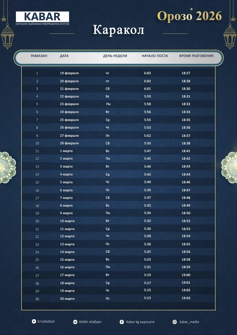 Агентство «Кабар» предлагает расписание времени ооз бекитүү и ооз ачуу для различных областей и городов Кыргызстана.