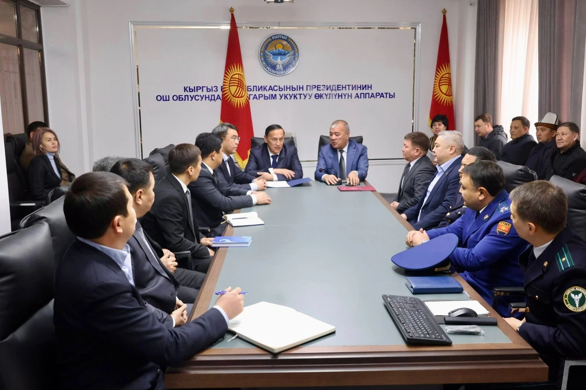 Сегодня в зале заседаний аппарата полномочного представителя президента КР в Ошской области заместитель председателя ГКНБ Алишер Эрбаев провел встречу, на которой ознакомил руководителей областных учреждений с новым начальником.