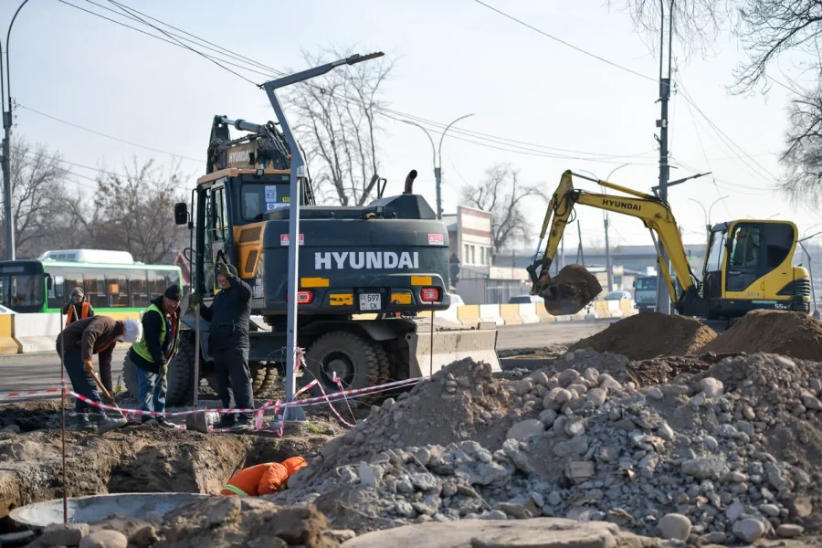 На южной стороне проспекта Дэн Сяопина продолжаются ремонтные работы между улицами Кайназарова и Сыдыгалиева. В районе пересечения с улицей Кайназарова также рассматривается возможность установки П-образных светофоров.