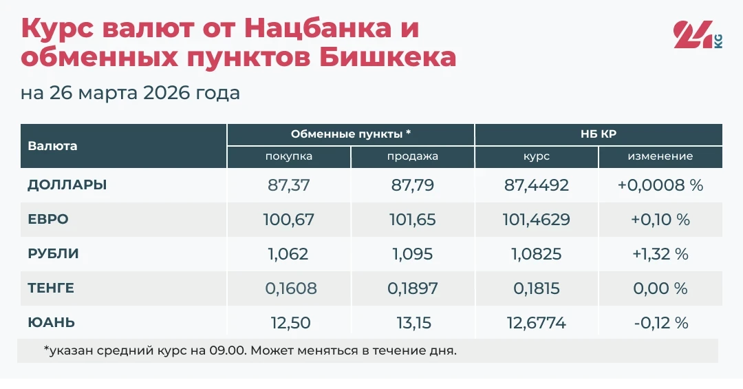 - Официальный курс НБ КР: 87,4492 сома (увеличение на 0,0008 процента).