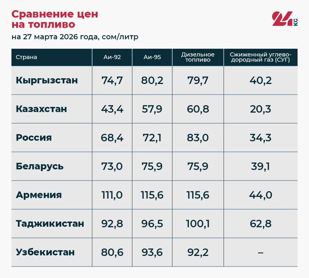 Тем не менее, как подчеркивает представитель антимонопольной службы, ценовая ситуация в стране остается под контролем. Цены на топливо в Кыргызстане ниже, чем в соседних странах, таких как Армения, Таджикистан и Узбекистан, и сопоставимы с ценами в Беларуси и России.
