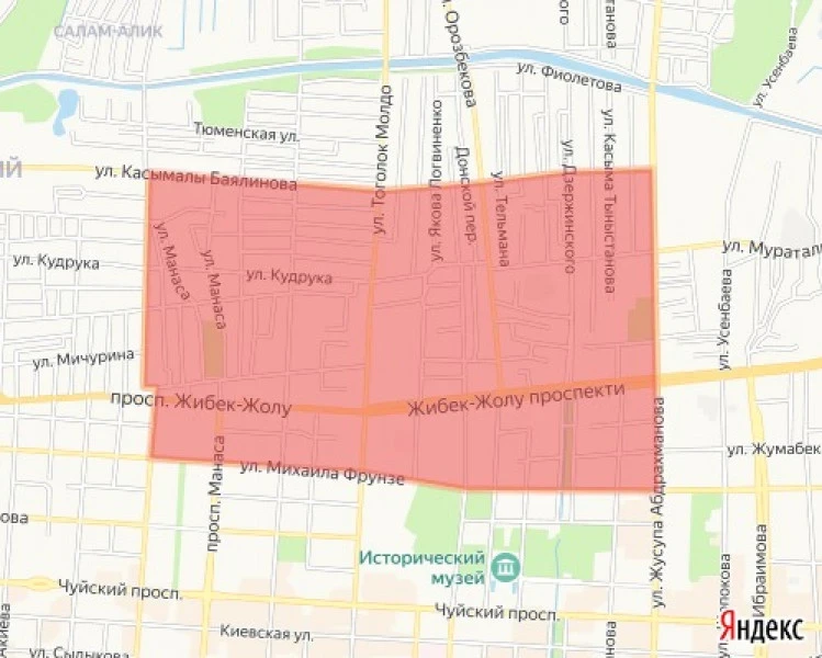 - проспект Чуй, улица Фрунзе, проспект Манаса, проспект Жибек Жолу, до реки Ала-Арчи, улица Турусбекова, улица Баялинова и улица Абдрахманова.