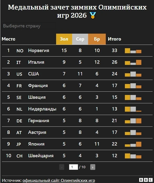 По завершении 12 соревновательных дней Норвегия продолжает удерживать лидерство в медальном зачете, за ней следуют Италия и США. В пятерку также входят Китай и Швеция. Борьба за верхние позиции остается напряженной, и каждый старт может изменить баланс сил.