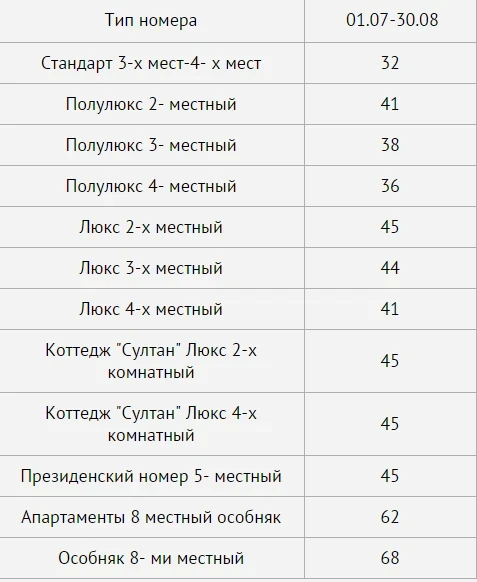 Президенский номер: Одноэтажный особняк, три спальные комнаты, мягкая мебель, холл, терраса, кухня, холодильник, набор посуды, микроволновая печь, три сан узла, фен, утюг, прихожая, кровати, ванная комната, спутниковое телевидение, горячее водоснабжение. От берега 150 метров