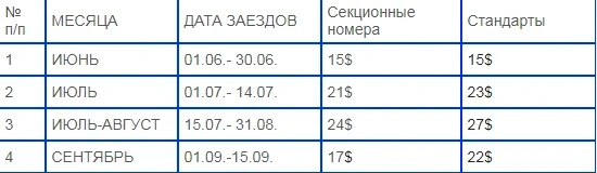 В стоимость путевки входит 3-х разовое питание. Цена указана в дол. за человека с питанием.