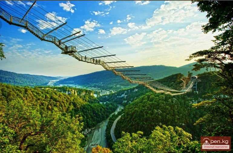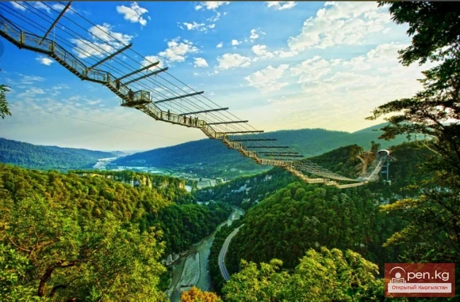 Невероятно раскрученный горный парк развлечений SkyPark Алана Дж. Хаккета в Сочи известен тем, что в нем находится самый длинный пешеходный мост в мире SkyBridge. Его длина составляет 439 метров и находится он на высоте 207 метров над рекой в живописной горной долине — над Ахтырским ущельем и рекой Мзымта.