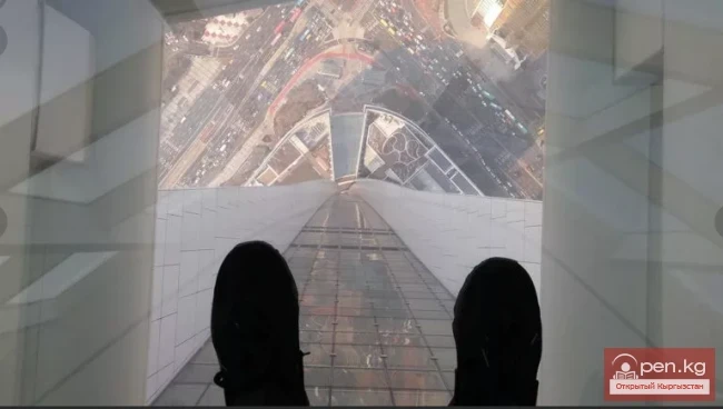 Со смотровой площадки открывается вид на город с высоты птичьего полета, а прямо под ногами — стеклянный пол и оживленный перекресток далеко внизу. С неё в ясную погоду можно увидеть окружающие окрестности на несколько десятков километров.