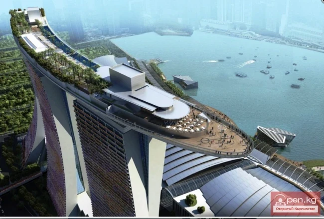 Государство Сингапур, которое состоит всего из одного города, в последние десятилетия не перестает удивлять мир своими экономическими достижениями и суперсовременными архитектурными сооружениями. Например пятизвездочный отель Marina Bay Sands, состоящий из трех зданий двухсотметровой высоты. Главная фишка для туристов - это огромный бассейн на крыше отеля в составе большого развлекательного центра "Небесный парк".