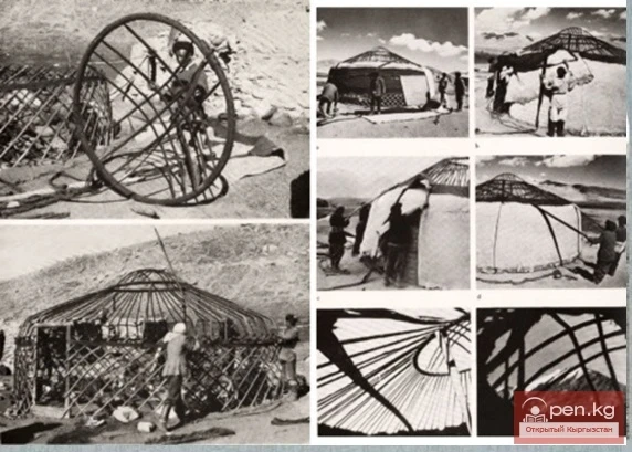С древности юрты киргизов отличают простота устройства, практическая целесообразность всех ее элементов, а также определенный порядок в установке. «Юрта, — писал Н. М. Пржевальский,— составляет незаменимое жилище. Ее можно быстро разбирать и переносить в другое место, в то же время она служит достаточной защитой от холода, зноя и непогоды. Действительно, в юрте, в то время, когда горит огонь, довольно тепло, даже в самый сильный мороз... летом войлочная оболочка такого жилища отлично защищает от жары и дождей, хотя бы самых проливных».
